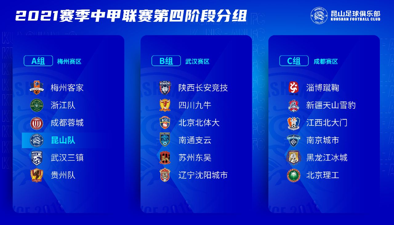 2021赛季中国足球协会甲级联赛第四阶段对阵日程表出炉,本阶段赛事将在11月21日-12月22日展开。昆山队将在梅州赛区与同组的梅州客家、浙江队、武汉三镇、贵州队4支球队进行8场比赛较量。