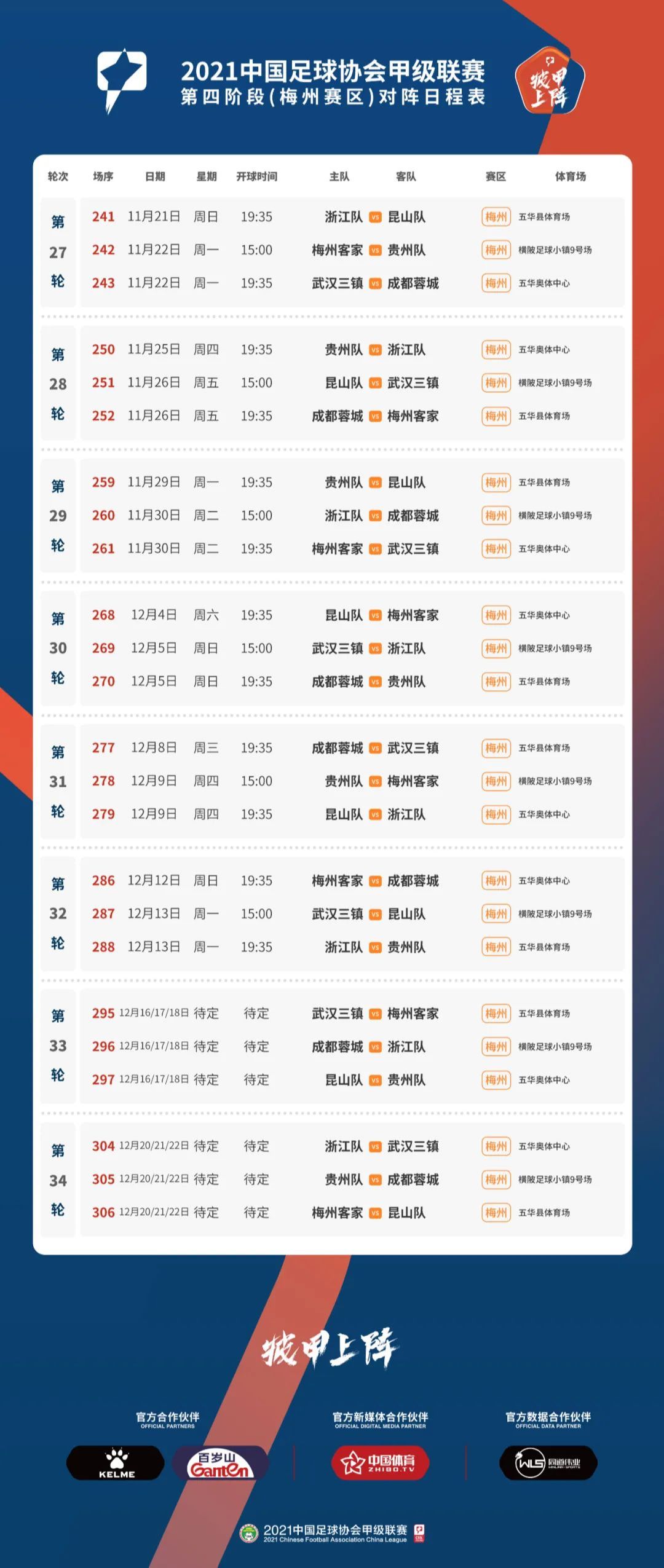 11月21日(周日)19:35,第四阶段首场比赛昆山队将在五华县体育场对阵浙江队。赛程表出炉,快快收藏吧!