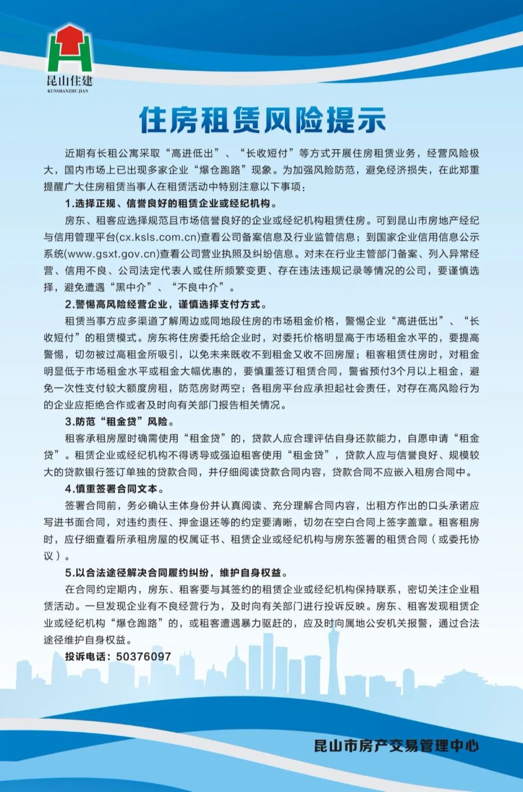为规避房屋租赁风险,防止租赁纠纷,请市民尽量选择在昆山市房地产经纪与信用管理平台入网的房地产经纪机构提供居间服务,查询网址http://cx.ksls.com.cn。