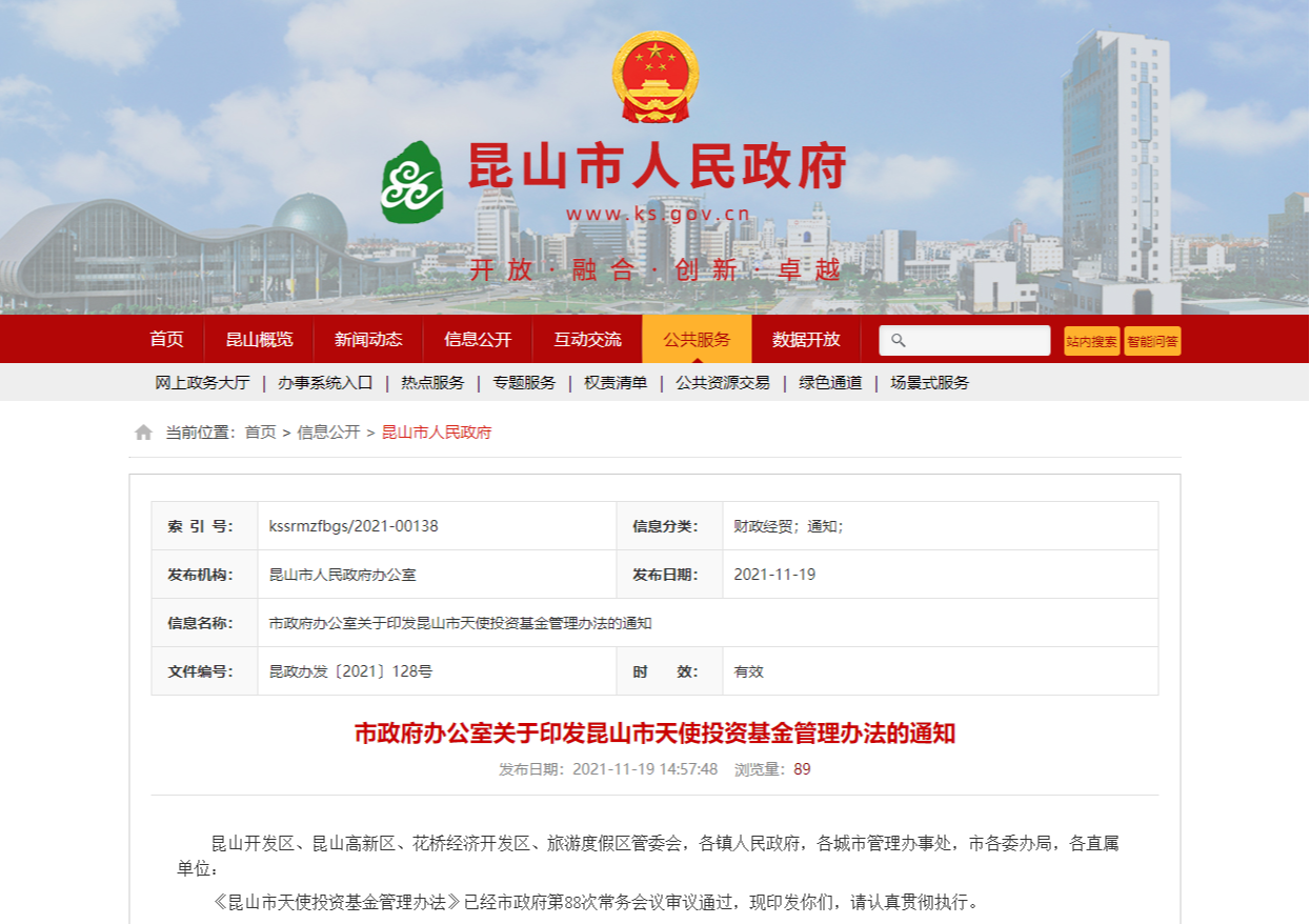 11月19日,《昆山市天使投资基金管理办法》发布。《办法》进一步规范昆山市天使投资基金管理与运作,支持昆山种子期、初创期人才科创项目发展,为昆山市“建设新城市,发展新产业,布局新赛道”提供金融支撑。