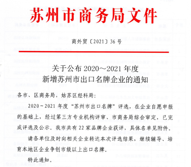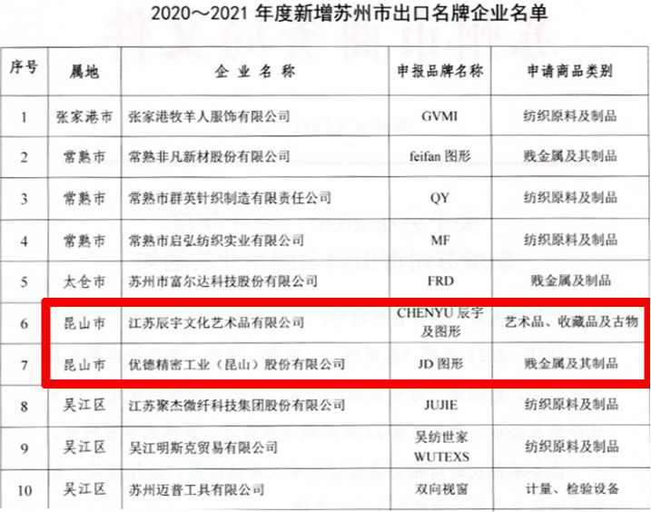 日前,苏州市商务局公布2020-2021年度新增苏州市出口名牌企业评选结果,昆山市优德精密工业(昆山)股份有限公司、江苏辰宇文化艺术品有限公司获评。