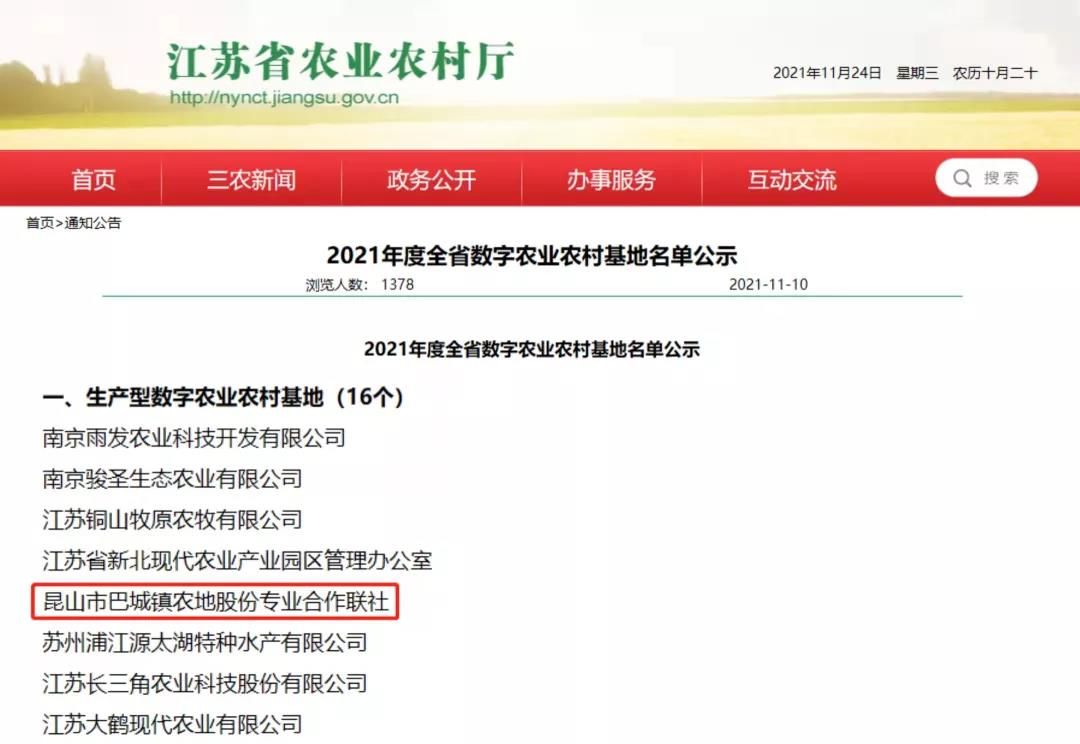 近日,江苏省农业农村厅公示2021年度全省数字农业农村基地名单,昆山市巴城镇农地股份专业合作联社榜上有名(生产型数字农业农村基地)。