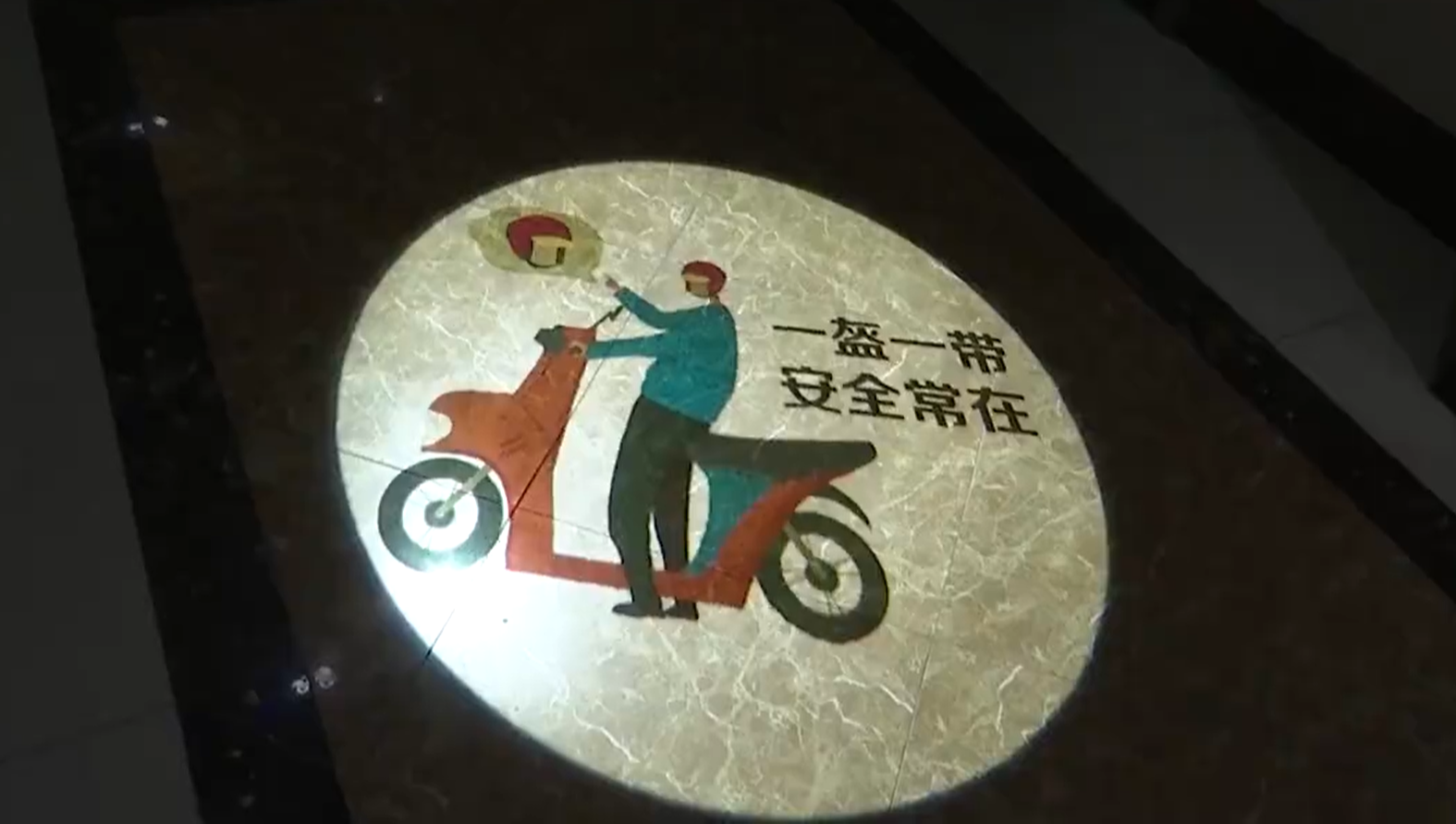 夜幕降临,宝衡社区衡山城国际花园小区的地面上浮现出五彩靓丽的图案,原来是光束在地面上投射出了宣传标语,有关于文明礼仪、出行安全、电动车规范停放以及志愿风尚等,让人眼前一亮。