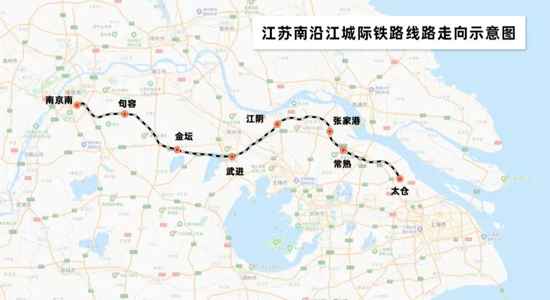 南沿江城际铁路正线全长278.53公里,设计时速350公里,始于南京南站,止于苏州太仓站,经沪通铁路一期接入上海,是沪宁通道的第二条城际铁路。