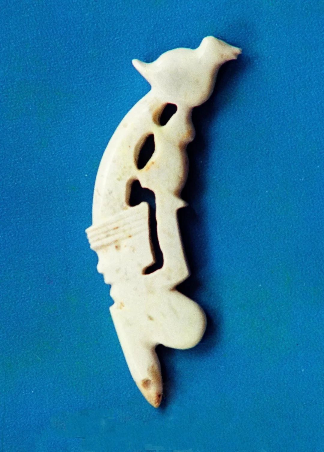▲赵陵山遗址出土的神人鸟兽透雕玉件。