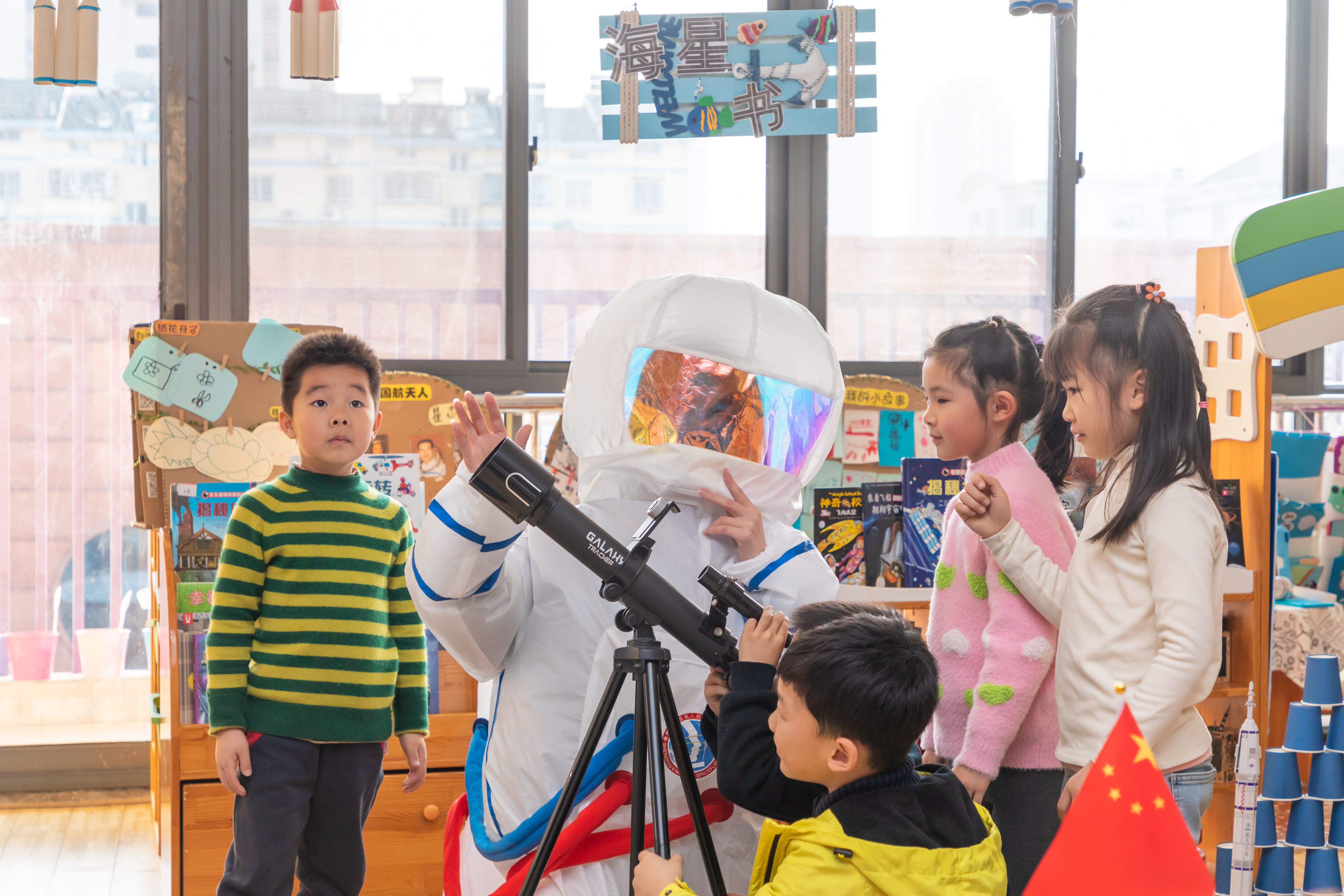 用木头、纸杯、奶粉罐等物品,搭建“发射台”“神舟十三号”“宇宙空间站”;班主任老师身穿“航天服”化身“宇航员”,与孩子们开展沉浸式互动……12月9日下午3点,在绣衣幼儿园大(6)班教室内,孩子们在观看“天宫课堂”直播之余,体验了一次别样的太空之旅。班主任身穿“航天服”,带着孩子们从用奶粉罐拼装的“运载火箭”,进入预定轨道,最终来到由积木搭建而成的“宇宙空间站”。在此过程中,老师还给孩子们同步讲解相关知识,让深奥的知识要点可视化、简单化。“看他们在太空里飘来飘去,我觉得特别神奇,长大后我也想去太空看看、去火星看看。”绣衣幼儿园小朋友傅哲羽说。