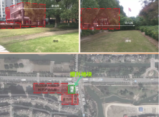 项目位于马鞍山路、思常路交界西南角,西侧紧邻昆山加拿大国际学校艺术幼儿部,改造前,场地绿化单一,以草坪和苗木为主,无停留空间,草坪踩踏严重,作为路口景观节点,急需改造提升。