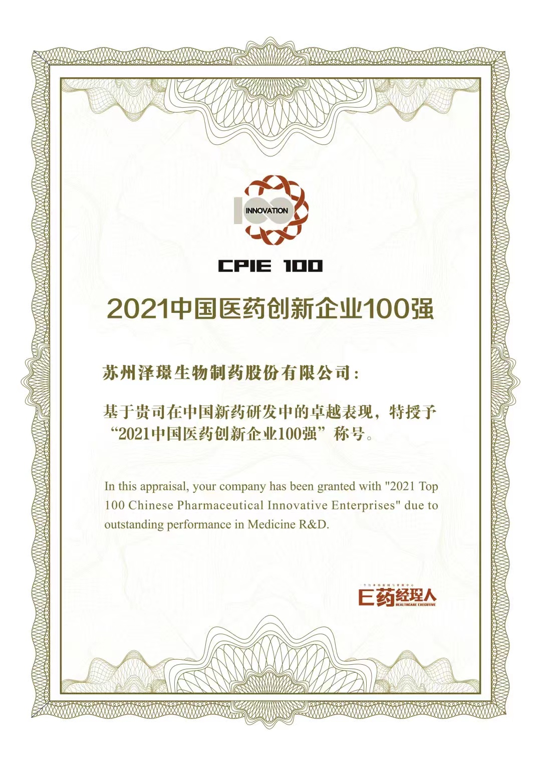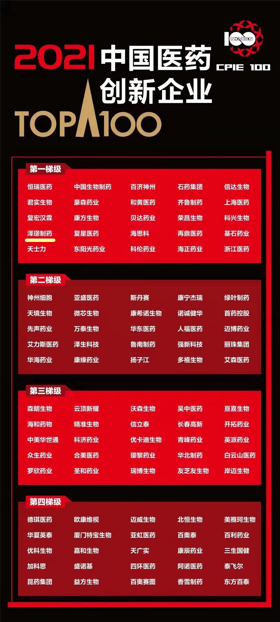 12月21日,2021中国医药企业家科学家投资家大会(简称“启思会”)在线上开幕,发布“2021中国医药创新企业100强”。泽璟制药创新实力再获认可,入选“2021中国医药创新企业100强”,并位列第一梯级。