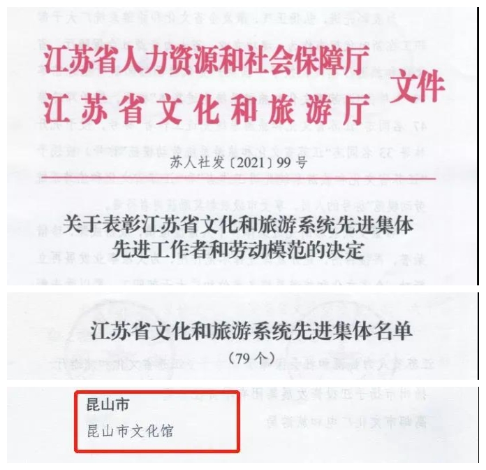 最近江苏省人力资源和社会保障厅、江苏省文化和旅游厅联合发文确定了一批江苏省文化和旅游系统的先进集体、先进工作者和劳动模范名单,昆山市文化馆荣获江苏省文化和旅游系统先进集体荣誉称号。