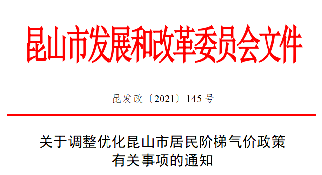 12月27日,昆山市发改委印发《关于调整优化昆山市居民阶梯气价政策有关事项的通知》,调整优化我市居民阶梯气价政策,提高分档气量标准,增加“一户多人口”年用气量及困难群体的免费用气量,自明年1月1日起执行。