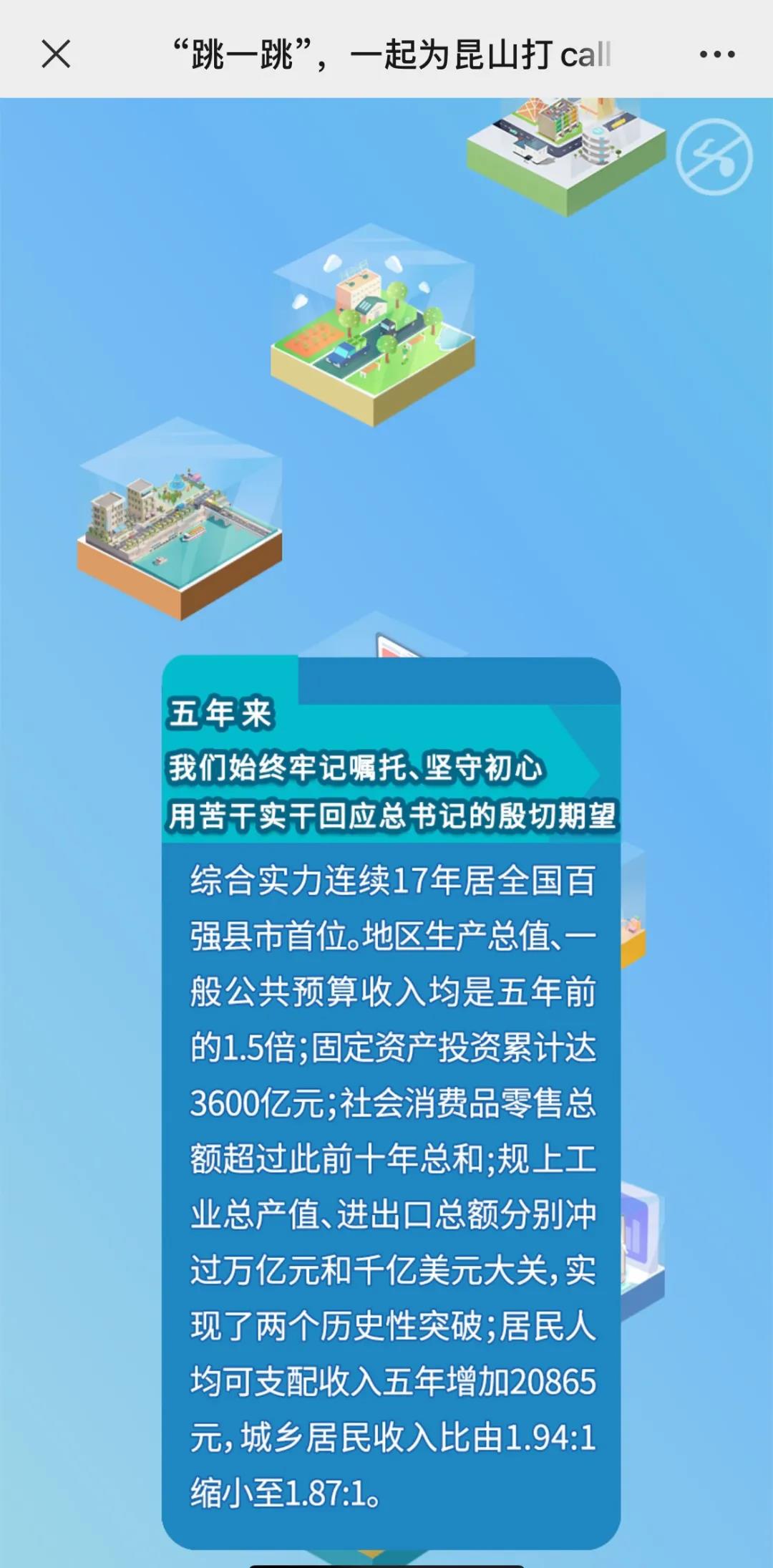 游戏通过微信小程序“跳一跳”的模式,让大家在玩游戏的过程中了解政府工作报告的内容,以寓教于乐的方式感受过去五年昆山的发展。