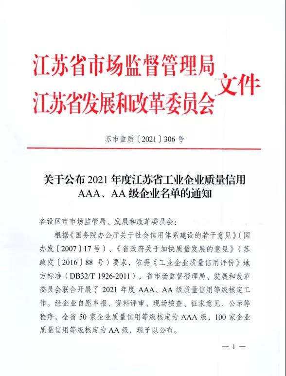 江苏省工业企业质量信用评价是省市场监管局、省发改委为强化质量诚信体系建设,发挥质量信用在助推高质量发展、创新监管机制方面的基础性作用而开展的一项工作。根据《国务院办公厅关于社会信用体系建设的若干意见》、《省政府关于加快质量发展的意见》要求,依据《工业企业质量信用评价》地方标准,省市场监管局、省发改委联合开展了2021年度AAA、AA级质量信用等级核定工作。经企业自愿申报、资料评审、现场核查、征求意见、公示等程序,全省50家企业质量信用等级核定为AAA级,100家企业质量信用等级核定为AA级。