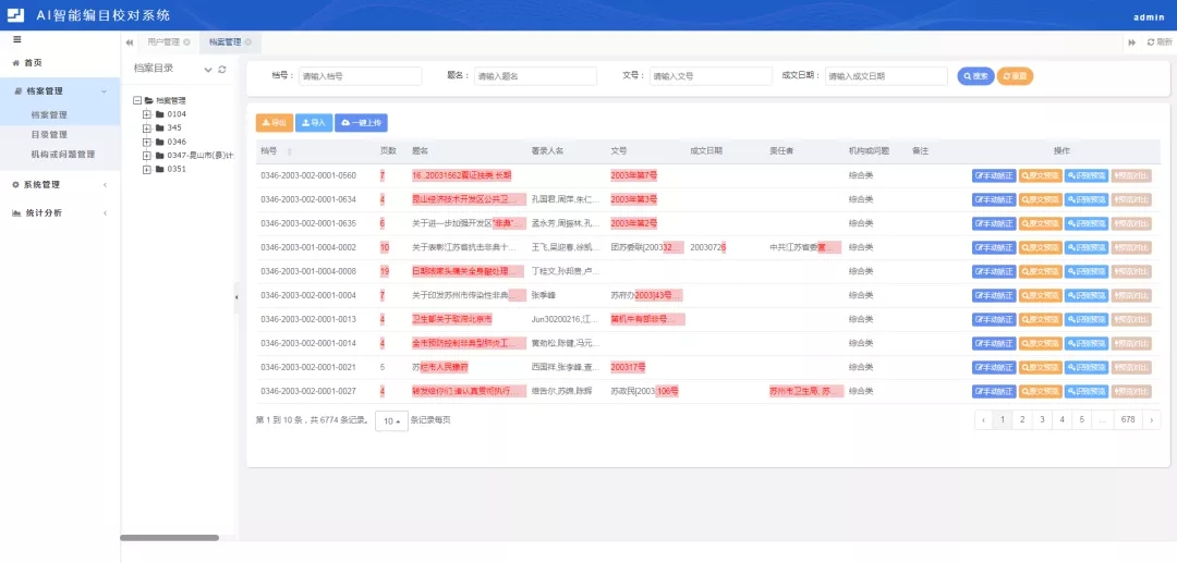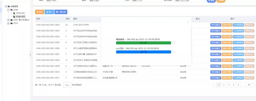 市档案馆在前期技术调研的基础上,经过积累和准备,在市大数据中心的支持配合下,于2021年9月正式启动基于机器学习算法的AI智能校对系统研发工作,将大量的档案数据机器学习与人工智能服务中台的文字识别(OCR)服务、自然语言(NLP)分析服务进行对接,通过预处理模块、文本检测模块、文字识别模块、语义分析预处理模块、对比分析模块等后台功能把纷繁复杂的档案目录和全文进行智能编目索引,并与原目录内容进行比对,实现档案数据智能校对。系统研发期间,克服诸多技术难点,如档案全文中包含大量手写体、表格、印章、下划线、指纹手印、特殊字符等,干扰识别程序,导致识别有误;不同部门的档案文件格式不统一,导致目录抽取不一致等。针对这些问题,研发组通过加大对特定区域机器学习分析和大量文本学习找寻题名等目录规律,经过不断试错纠正,将识别正确率提升至90%以上。