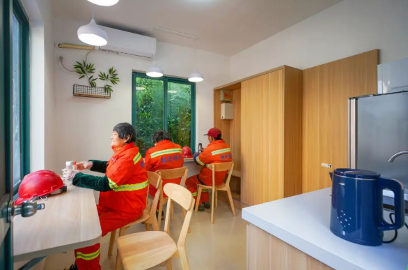 优美的城市环境离不开城市建设一线工作者的辛勤付出。为解决他们长时间户外工作中存在的饮水难、吃饭难、躲雨难、休息难等问题,市绿化管理部门结合“我为群众办实事”实践活动,在市管绿地范围内通过改造小仓库、管理用房及制作装配式用房等方式,设置了一批集休息、用餐、交流、应急于一体的“小薇·绿色驿站”。2021年,中环内共建设驿站25个,初步实现了暖心设施“从无到有、从有到好”。此外,这些驿站还不断扩大服务覆盖面,并和相关部门行业融合,逐步打造成服务市政基础设施一线工人的“共享之家、幸福小筑”。