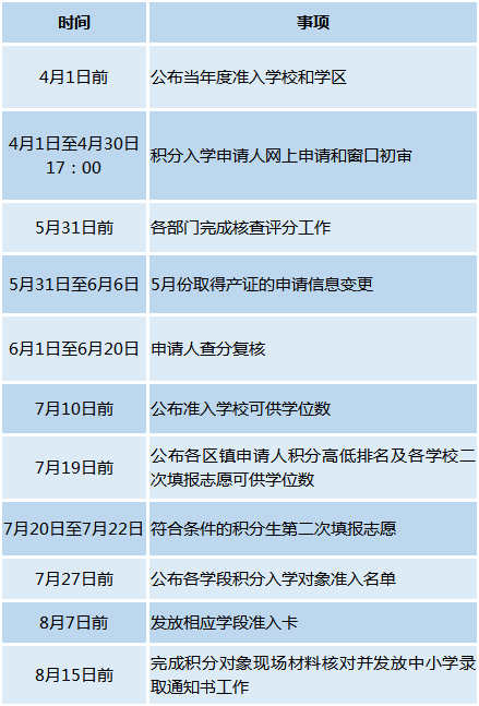 新市民子女积分入学实行政策公开、程序公开、结果公开,主动接受社会各界的监督。4月1日前公布当年度准入学校和学区;7月10日前公布准入学校可供学位数;7月19日前公布各区镇申请人积分高低排名及各学校二次填报志愿可供学位数;7月27日前公布各学段准入名单。以上信息均在中国昆山网(www.ks.gov.cn)上公布。