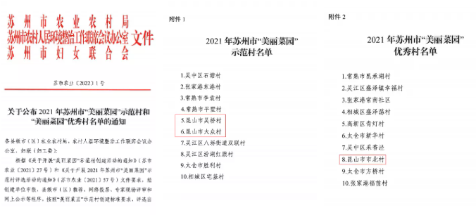近日,苏州市农业农村局发文公布2021年苏州市“美丽菜园”示范村和“美丽菜园”优秀村名单,千灯镇吴桥村、高新区大众村获评 “美丽菜园”示范村,周市镇市北村获评 “美丽菜园”优秀村。
