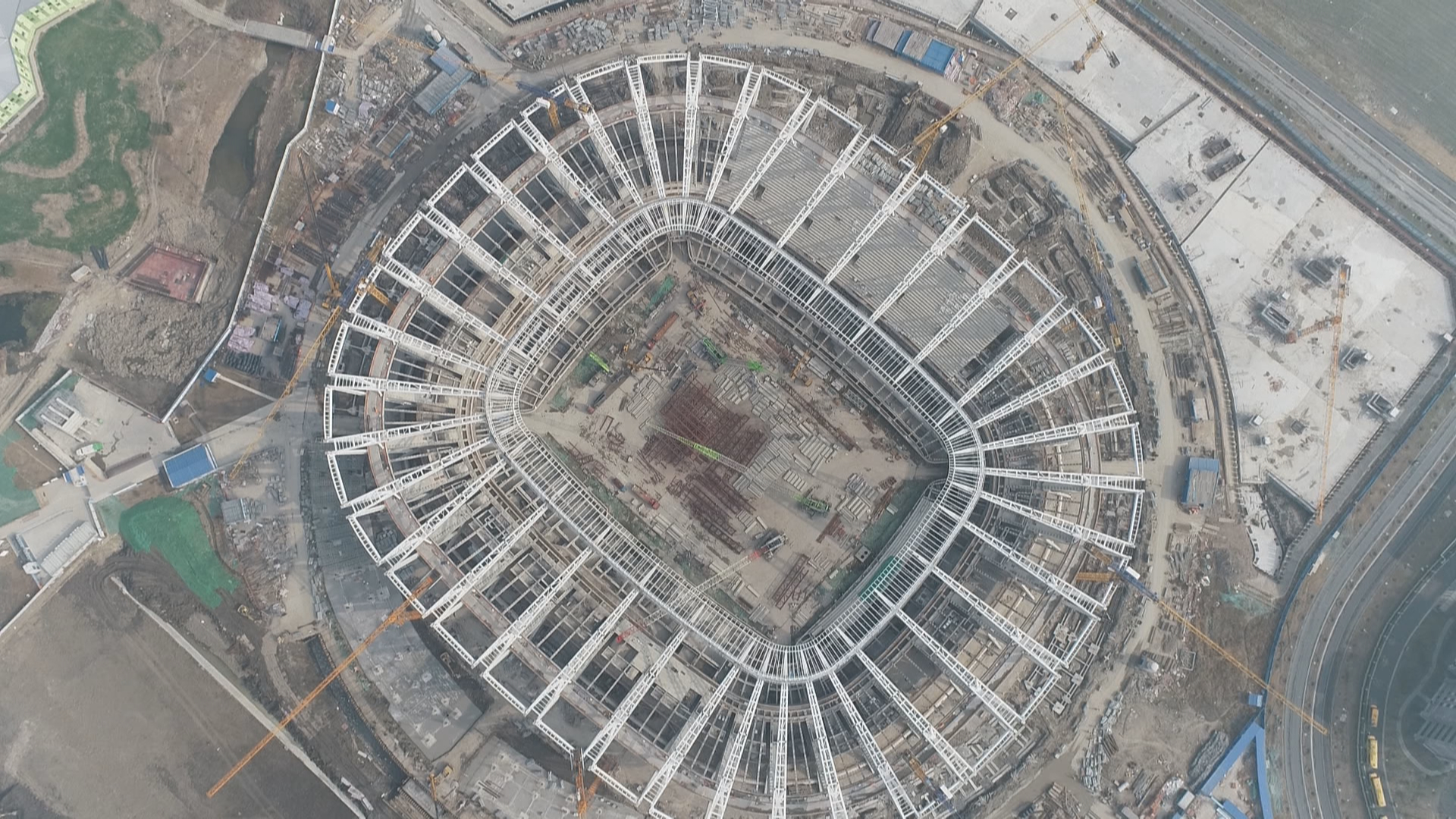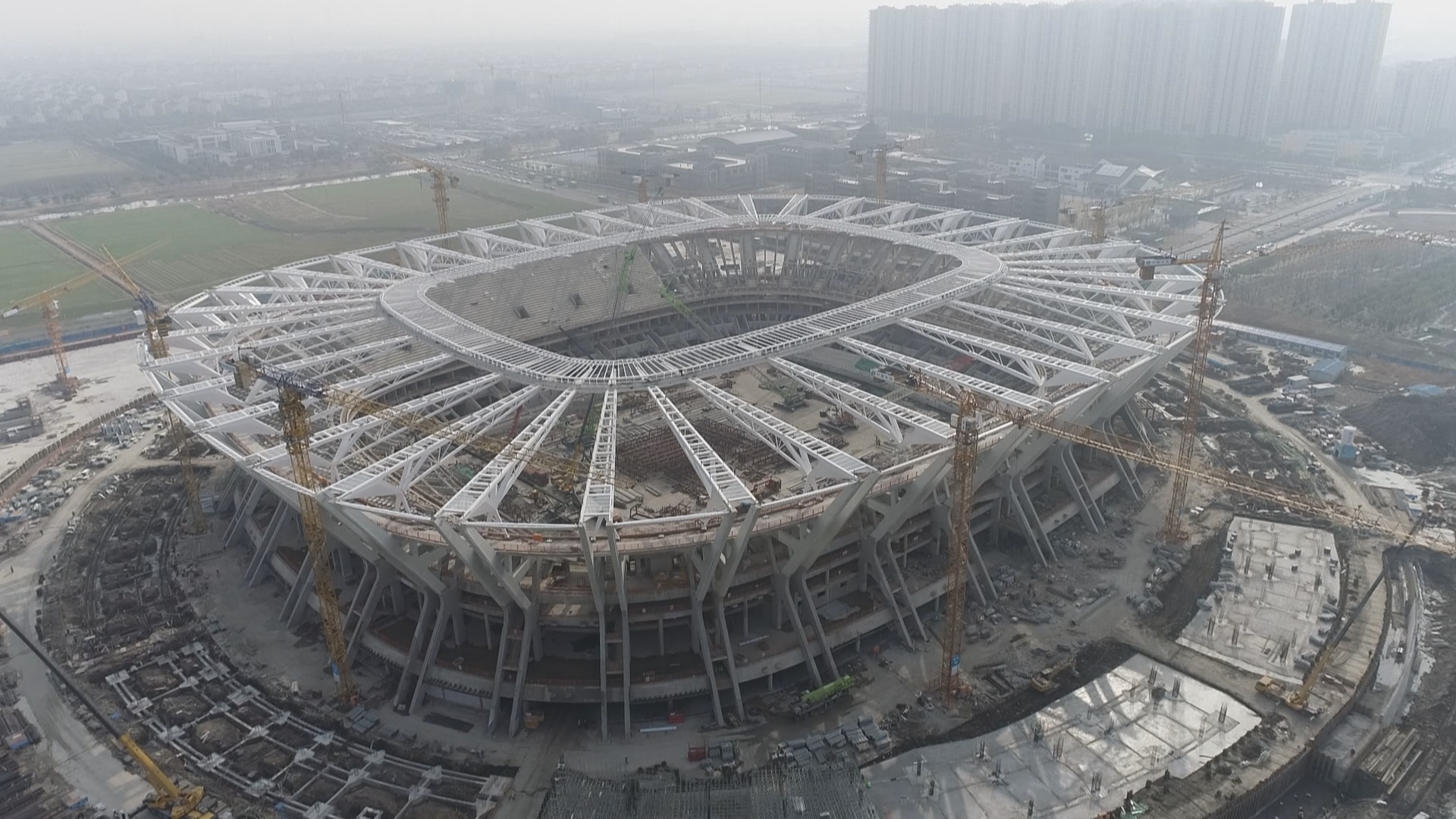 昆山市专业足球场项目工地上,90%的外围脚手架已被拆卸,主场馆轮廓展现出建筑的力量感,极富视觉冲击力。