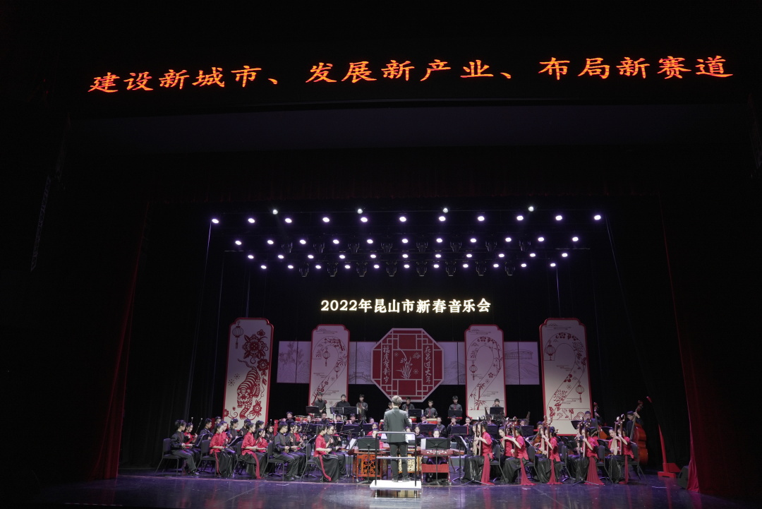 1月21日晚,昆山梁辰鱼昆曲剧场内丝竹悠扬、妙喉婉转,“福虎贺新岁,在昆过大年”2022年昆山市新春音乐会精彩上演。昆山市琼花艺术团民乐团、昆山市青少年宫小琼花民族管弦乐团与昆山当代昆剧院联袂献艺,以线下演出和线上直播相结合的方式喜迎虎年,用一曲曲脍炙人口的经典民乐“奏响”新春音符。