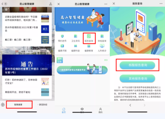 1.关注“昆山智慧健康”微信公众号,点击菜单栏“智慧健康”,进入后点击“报告查询”-“核酸报告查询”。