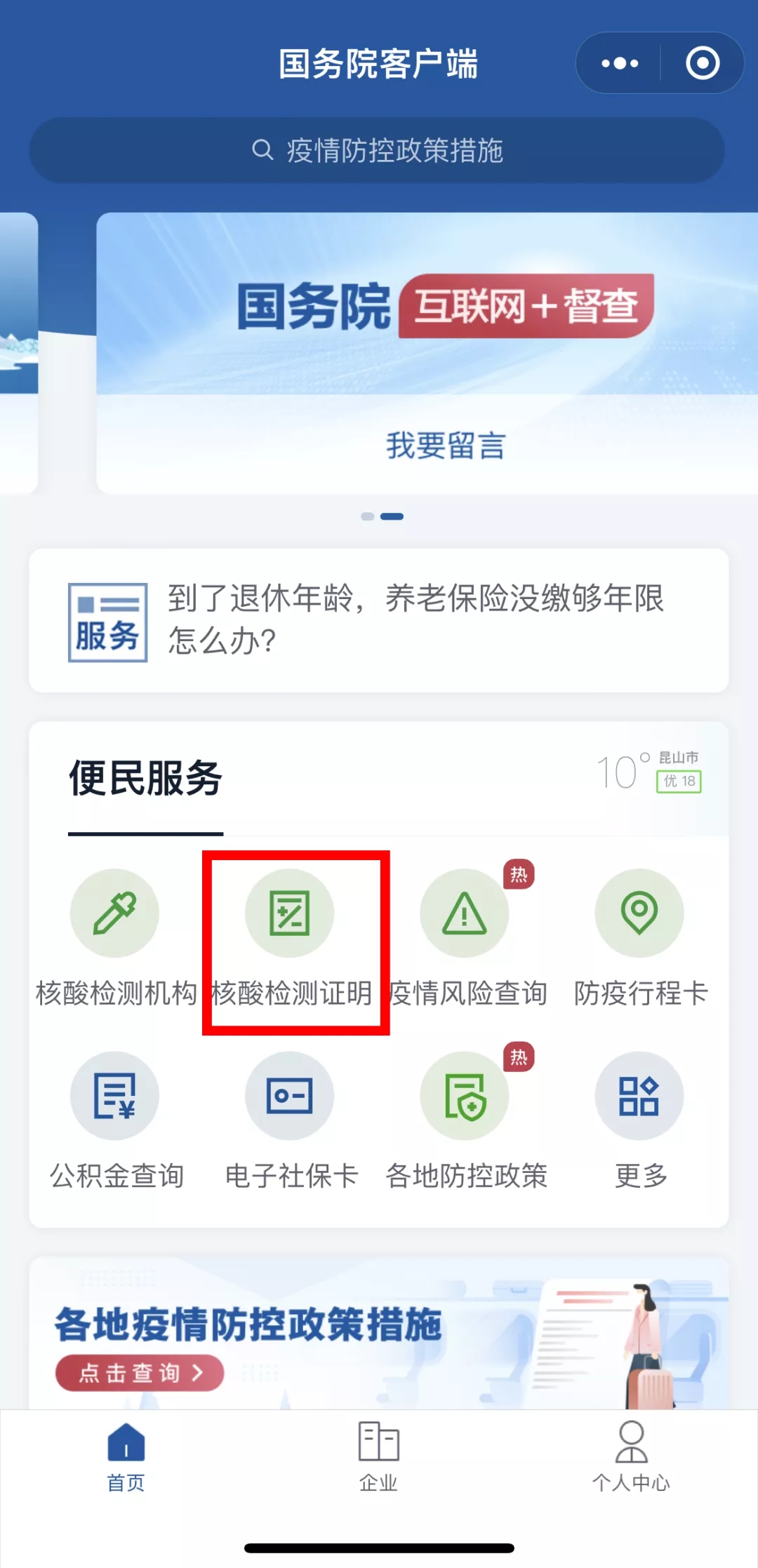3.登录“国务院客户端”微信小程序,点击“核酸检测证明”即可查询。