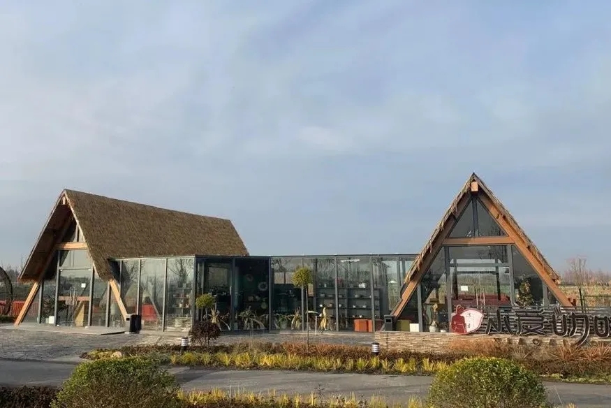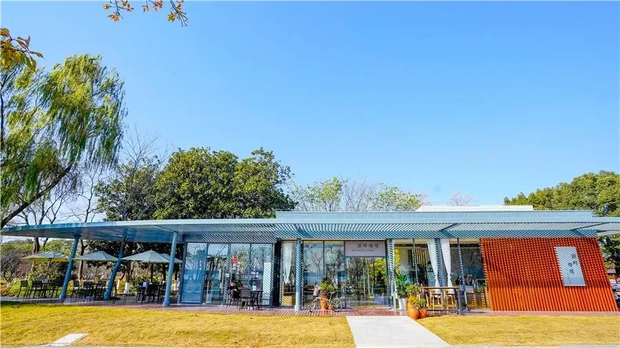 淀山湖镇红星村和永新村之间,有一条被高大的水杉紧紧拥抱的小道,“小爱咖啡”就伫立在路边。金黄的茅草屋顶、玻璃立面,周边搭配上各种鲜艳的色彩,在宁静的小村旁显得卓尔不群。