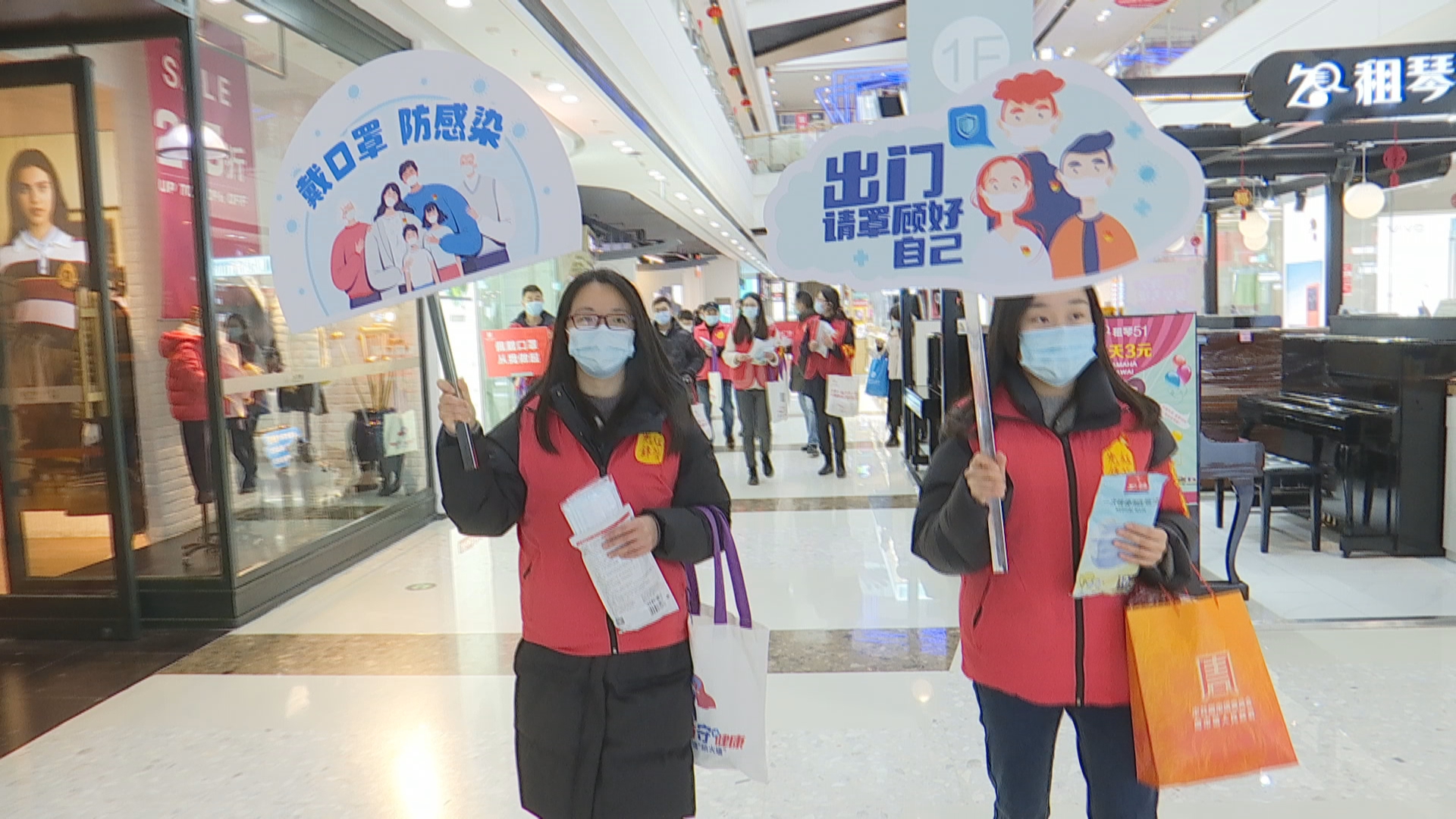 各大商业综合体是市民假日出行的首选地之一。在位于青阳路的万达广场内,志愿者们向商户、市民宣传防疫知识,发放口罩,提醒遵守防疫相关规定。退休老党员志愿者孙雪良表示:“作为一名退休老党员,能够参加志愿者活动,为社会作贡献,我感到很荣幸。”