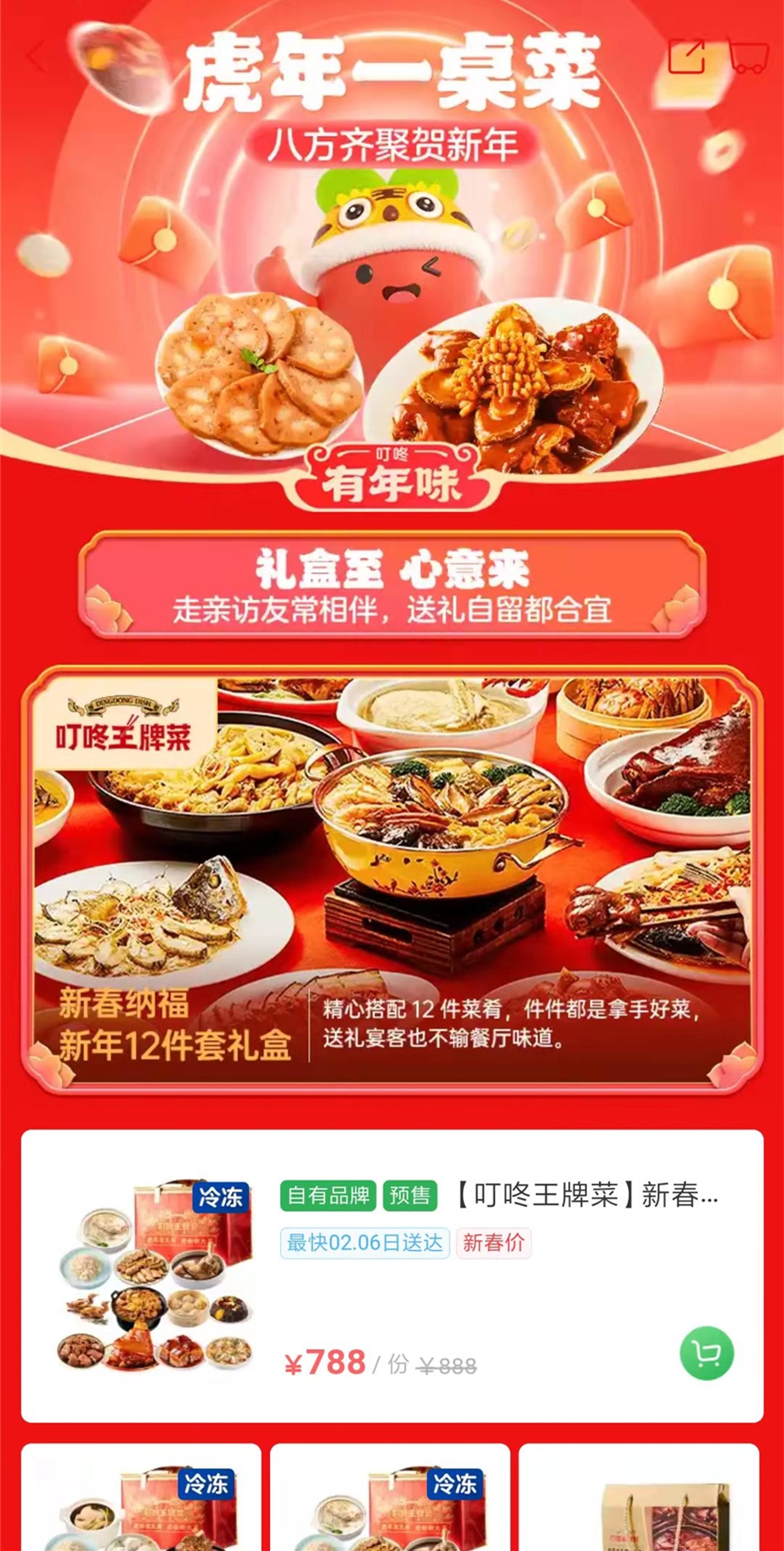与此同时,叮咚买菜线上平台也推出了预制菜系列,集结了各地王牌菜,包括巫溪川式腊味、港式大盆菜、云南菌菇鸡汤锅、徽州一品锅、淮扬清炖狮子头、内蒙古碳烤风味羊后腱等,可以满足各种口味需求。市民杨先生是叮咚买菜的会员,他表示,叮咚预制菜品类繁多,并且颇具各地特色,在丰富年夜饭的同时也让年夜饭更具家乡味道。