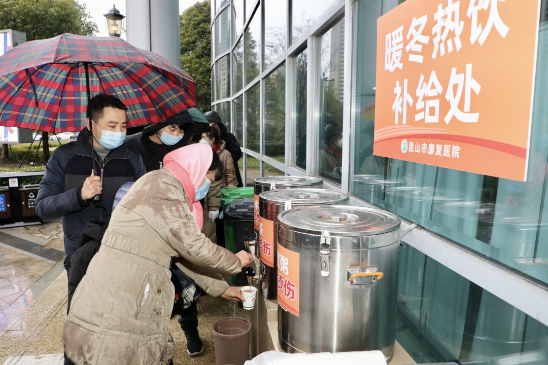 2月7日上午9点,记者在昆山市康复医院核酸采样点看到,医院工作人员已提前准备好遮雨棚,并在排队处设置暖冬热饮补给处,准备了姜茶、八宝粥等热饮,军大衣、棉服、暖宝宝等取暖用品也已准备就绪。“初八上班,单位要求凭核酸检测报告报到,今天抓紧来做一下。”老家山东的靳先生一早带着女儿来到昆山市康复医院核酸采样点,并在工作人员指引下快速完成了采样。