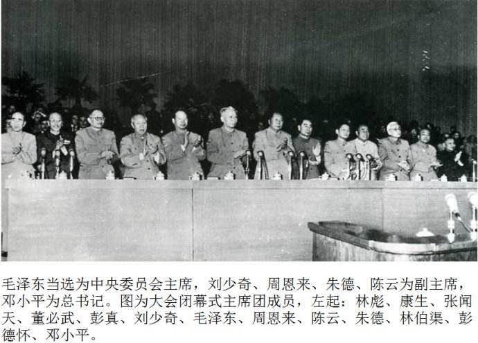 26日、27日,大会一致通过《中国共产党章程》、《关于政治报告的决议》和《关于发展国民经济第二个五年计划的建议》,并以无记名投票的方式,选举产生了中央委员会委员97人和候补中央委员73人。在28日举行的八届一中全会上又选举产生了新的中央领导机构。毛泽东当选为中央委员会主席;刘少奇、周恩来、朱德、陈云当选为副主席;邓小平当选为中央委员会总书记。上述6人同时为中央政治局常委。政治局委员除了上述6人外,还有林彪、林伯渠、董必武、彭真、罗荣恒、陈毅、李富春、彭德怀、刘伯承、贺龙、李先念等11人。此外,还选举产生了中央书记处和中央监察委员会等。