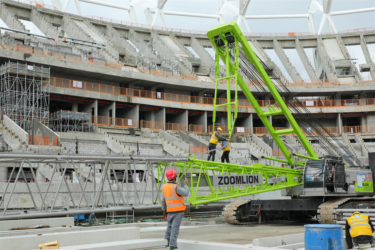 在昆山专业足球场建设工地,工人们正在抢抓工时,紧张施工。