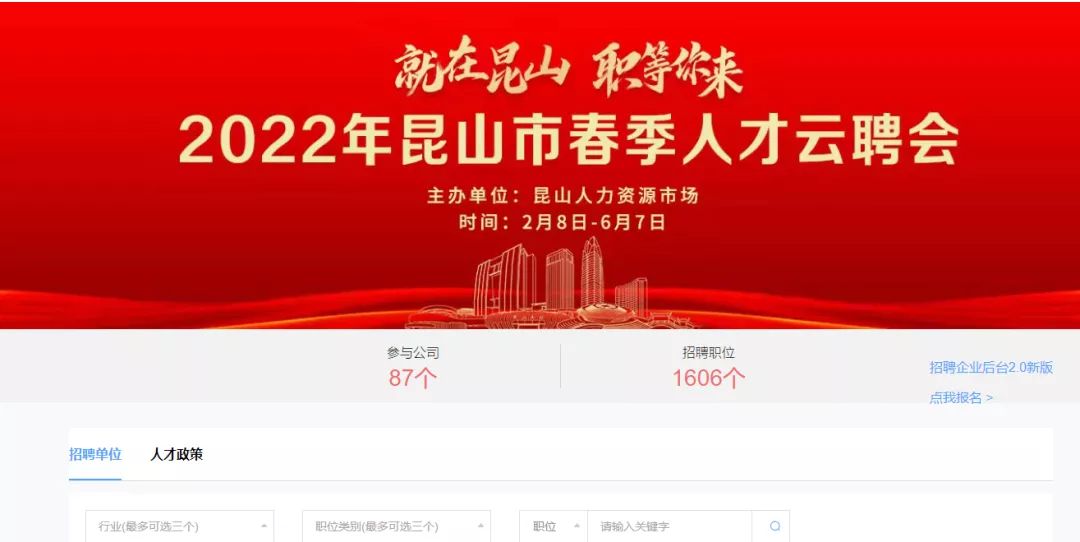 为了充分落实市委市政府“聚力建设新城市、大力发展新产业、全力布局新赛道”的奋斗目标,本次云招会不向本市企业收取任何费用,企业只需在报名网址(https://ksrcsc.zhaopin.com/)规范填写注册信息,经昆山人力资源市场审核通过后即可发布岗位信息,建立线上招聘通道。云平台还提供在线咨询、定向搜索、视频面试、消息提醒等功能,充分满足企业和人才线上交流沟通的需求。