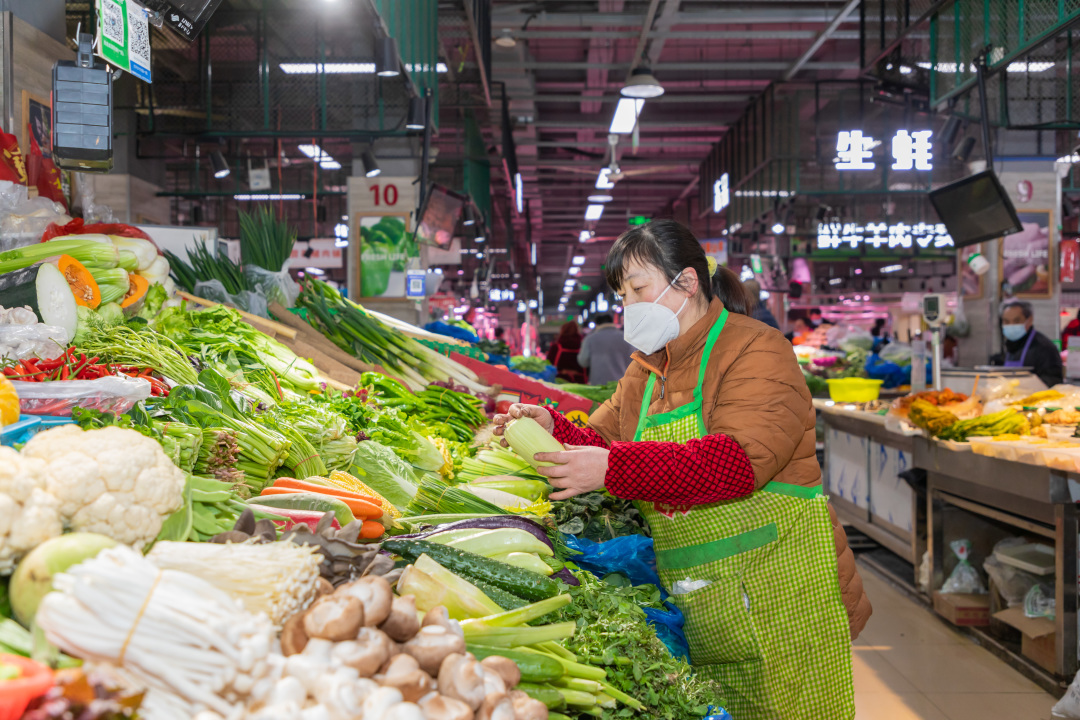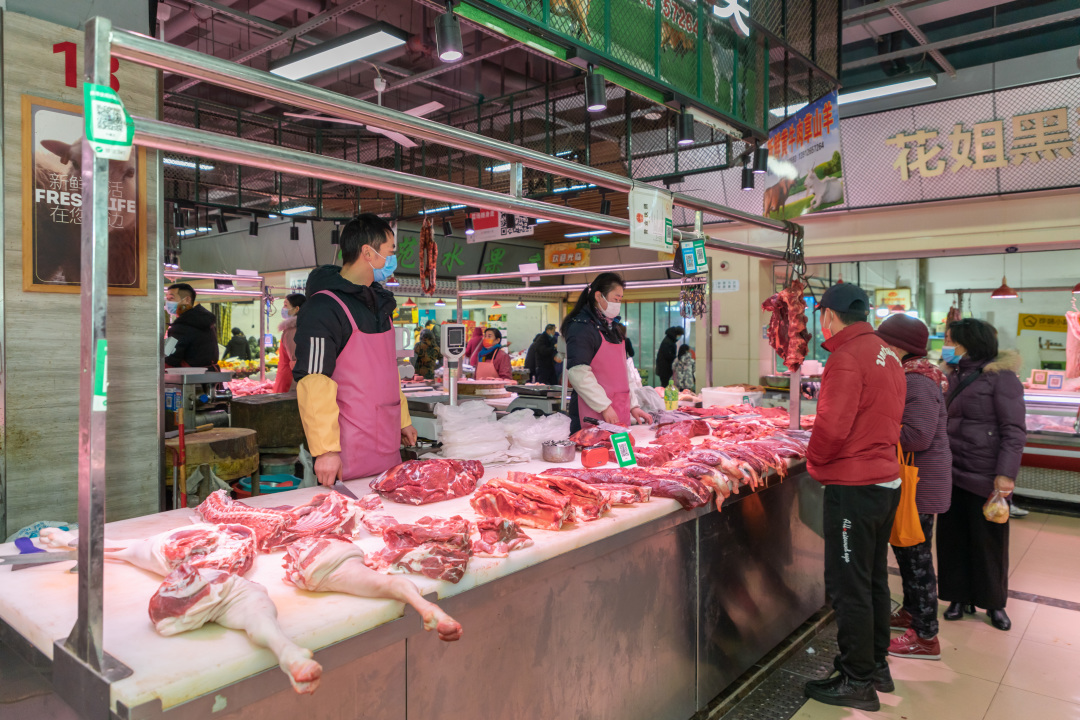 作为老百姓身边重要的“菜篮子”,农贸市场的平稳运行至关重要。走进玉龙菜场,记者了解到,目前肉、禽、蛋、蔬菜、水果、水产品等农副产品市场供应充足,价格平稳。其中,蔬菜价格甚至较前段时间还有所回落。玉龙菜场管理人员王文花介绍道:“目前菜场货源充足,运行平稳,农副产品价格和春节期间相比,青菜、东笋、黄瓜等蔬菜及肉类都有所下降。”