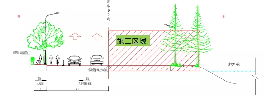 第二阶段:2022年4月12日-2022年5月20日,利用已完成的西半幅道路双向两车道通行,对东半幅道路封闭施工。