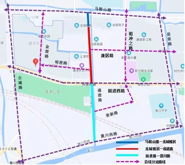 外围车辆可从思常路、祖冲之路、古城路、震川西路、前进西路、马鞍山路绕行。