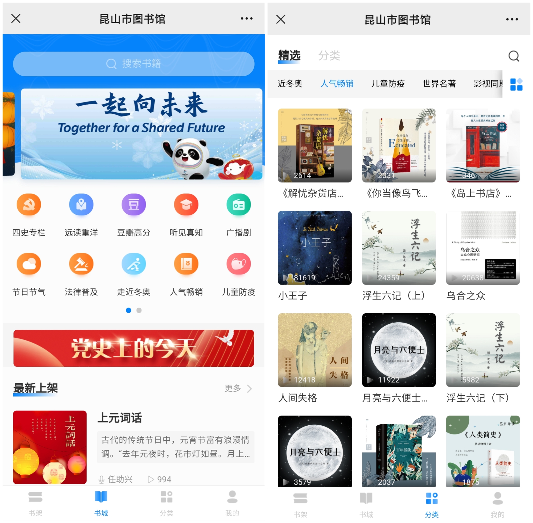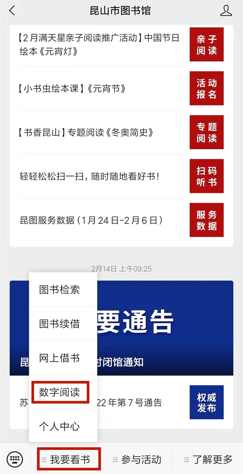 为了满足市民阅读需求,市图书馆通过“云服务”,推出多种数据库资源,包括电子书、听书、期刊、少儿绘本等,为大家提供线上服务。关注“昆山市图书馆”微信公众号,在公众号菜单中打开“我要看书—数字阅读”可以在页面中选择想看的资源模板。