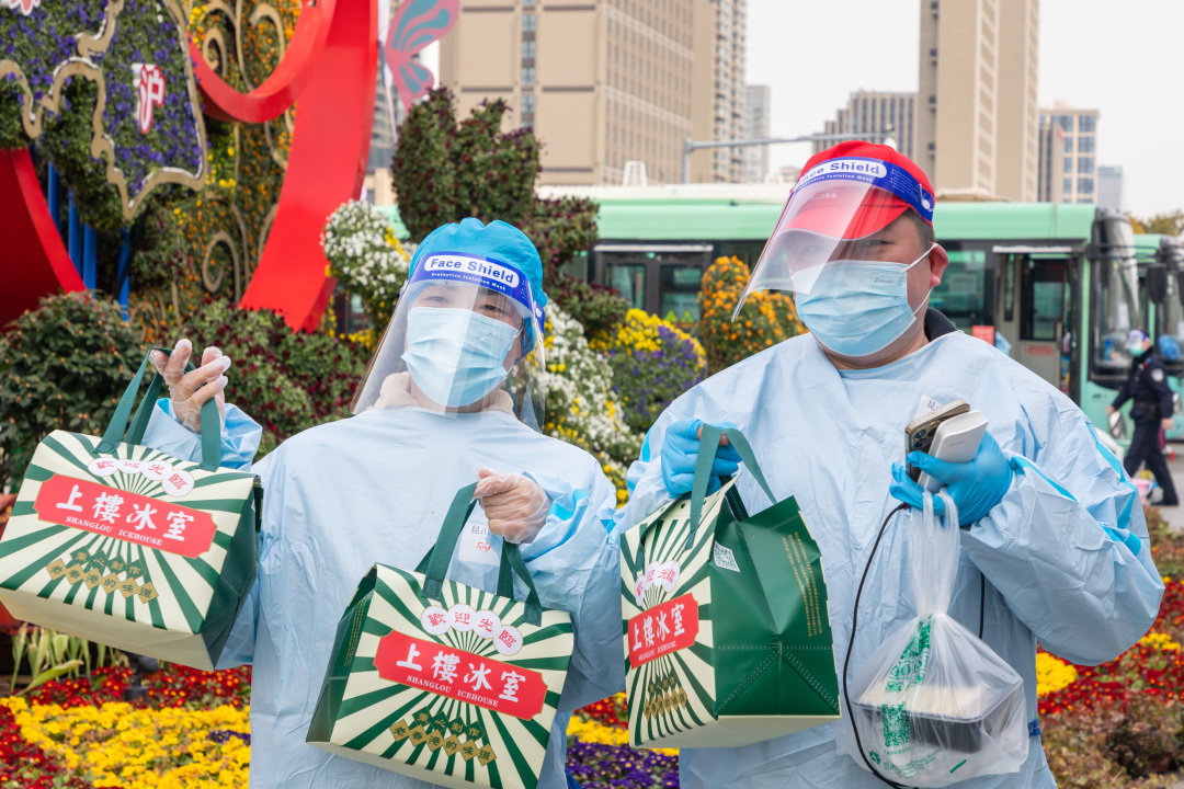 2月21日12时左右,志愿者余志成已经在昆山高铁南站北广场采样点连续服务了近6小时。尽管穿着厚厚的冬衣和防护服,他依旧感到有些寒冷。这时,江苏上楼冰室餐饮管理有限公司工作人员朱泉拎了几袋刚做好的菠萝包、猪扒包、吐司等食品,递给了余志成。“你们辛苦了!请你们吃些热点心暖和暖和吧。”朱泉说,希望公司的点心能为大家送上一分温暖。