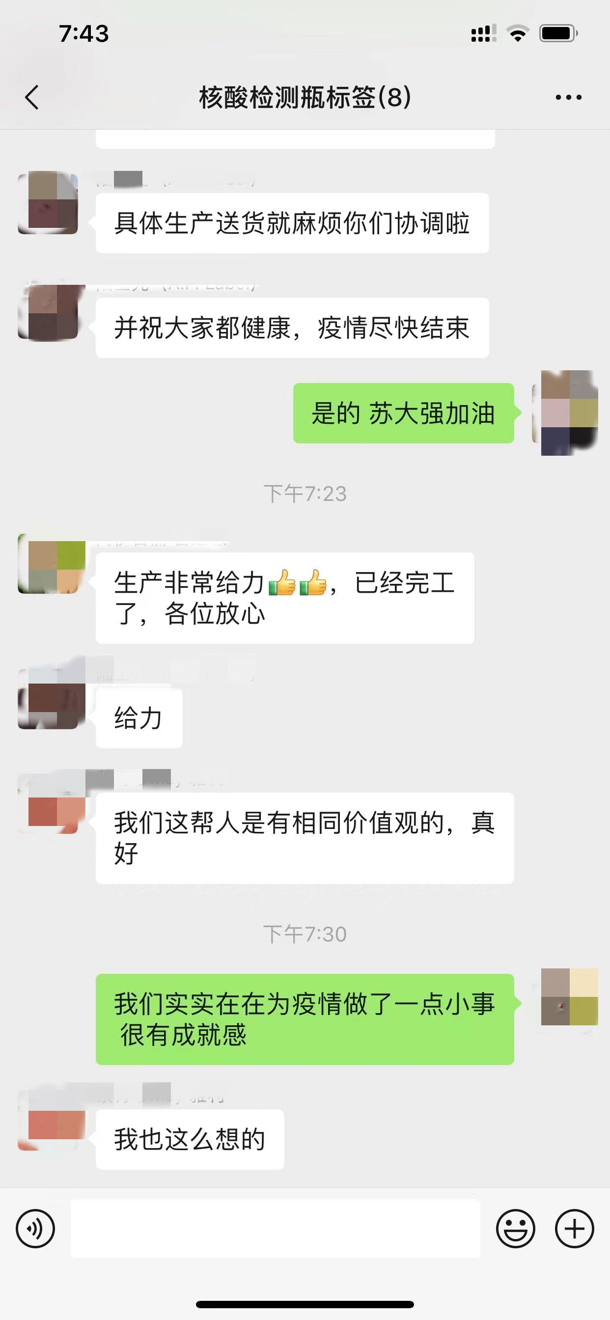 “生产非常给力,已经完工了,大家放心。”2月16日19:23分,艾利丹尼森(中国)有限公司华东区客户服务经理管红慧发在“核酸检测瓶标签”群内的这句话,让屏幕前的7人都激动不已:“给力!”“我们这帮人是有相同价值观的,真好!”“我实实在在为疫情做了一点小事,很有成就感!”……