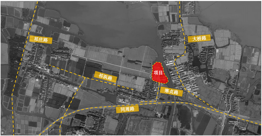 项目位于周庄镇北部,同周公路以北约300m,南临万三酒庄,西临寒贞港,东临姚家港,三面环水,环抱稻田,基地周边自然环境优美,江南水乡文化底蕴深厚。