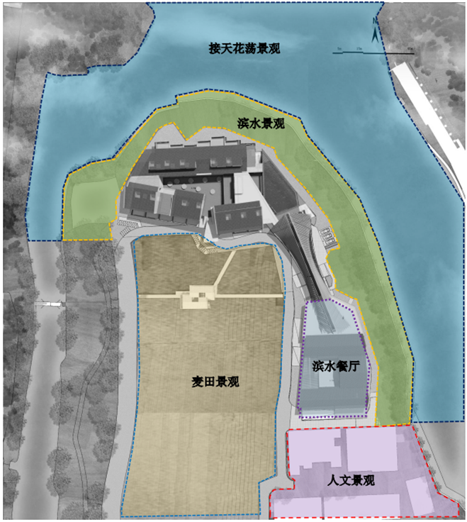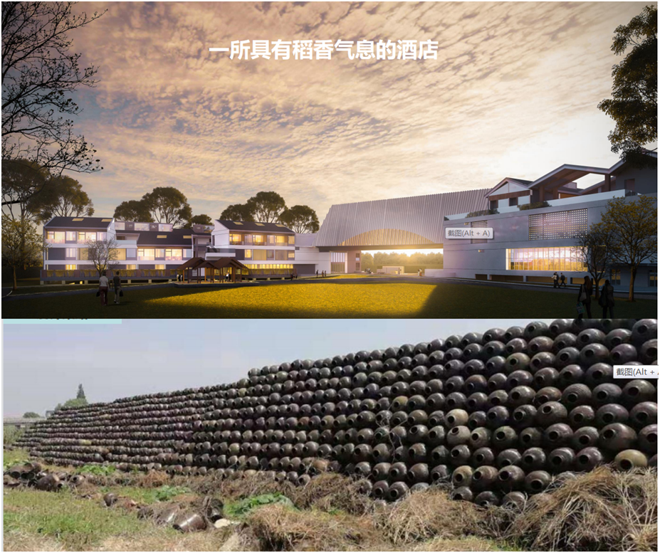 方案总体布局视野开阔,远处天花荡一览无余。内部稻田田趣横生,赋予这座酒店不一样的气息,基地内部设计堆放大量空酒坛,营造酒店周边特色景观。