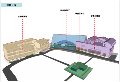 项目北侧为客房部分:每一层均布置客房。底层休息区为合院的形式,强调归属感、文化氛围以及院落个性特色;一层屋顶为二层室外内院,该层次丰富错落,空间强调趣味与共享;南侧为公共部分:一层为大堂、餐饮、宴会,二层为连廊及商务会议,三层为亲子套房及设备用房。连廊用于连接两大部分,以利于明确功能分区,使得内外交通联系方便、各种流线组织良好,保证客房及公共部分具有良好的居住和活动环境。