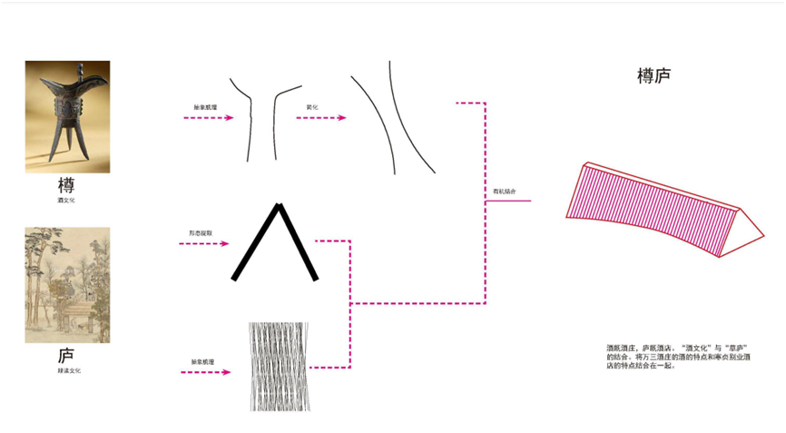 建筑设计以“樽”“庐”为文化核心,形成南北向的架空廊轴,整条廊轴从三角形的造型到抽象提取的选材紧扣“樽”“庐”文化,酒即酒庄,庐即酒店,将万三酒庄酒的特点和本酒店的特点结合在一起,现代风格的简约和抽象使自然和文化信息得到最强的呈现。
