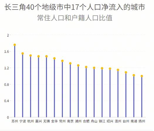 根据普查统计数据,长三角40个地级市中,有17个城市为人口净流入。其中9城位于浙江,7城位于江苏,安徽仅有合肥入选。