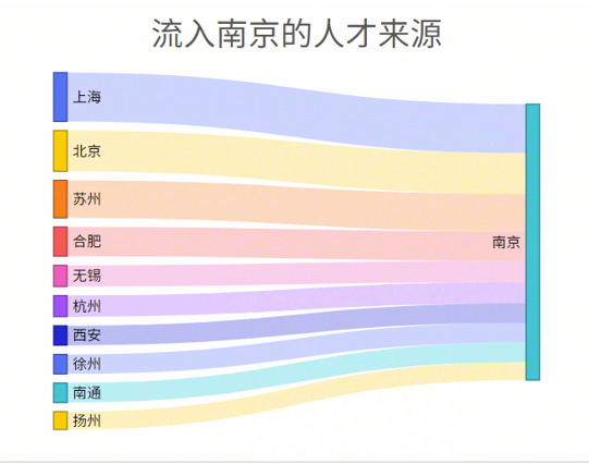 从具体的流向来看,人才向南京流入的前十大城市分别是上海、北京、苏州、合肥、无锡、杭州、西安、徐州、南通、扬州,其中有8个是长三角城市。从去向看,南京人才外流的前十大城市分别为上海、无锡、苏州、杭州、北京、徐州、常州、南通、合肥、扬州,有9个是长三角地区。