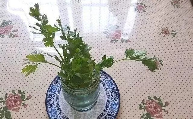 准备丢掉的香菜根(倾斜剪下来并要留有一部分的茎部)、容器、适量水