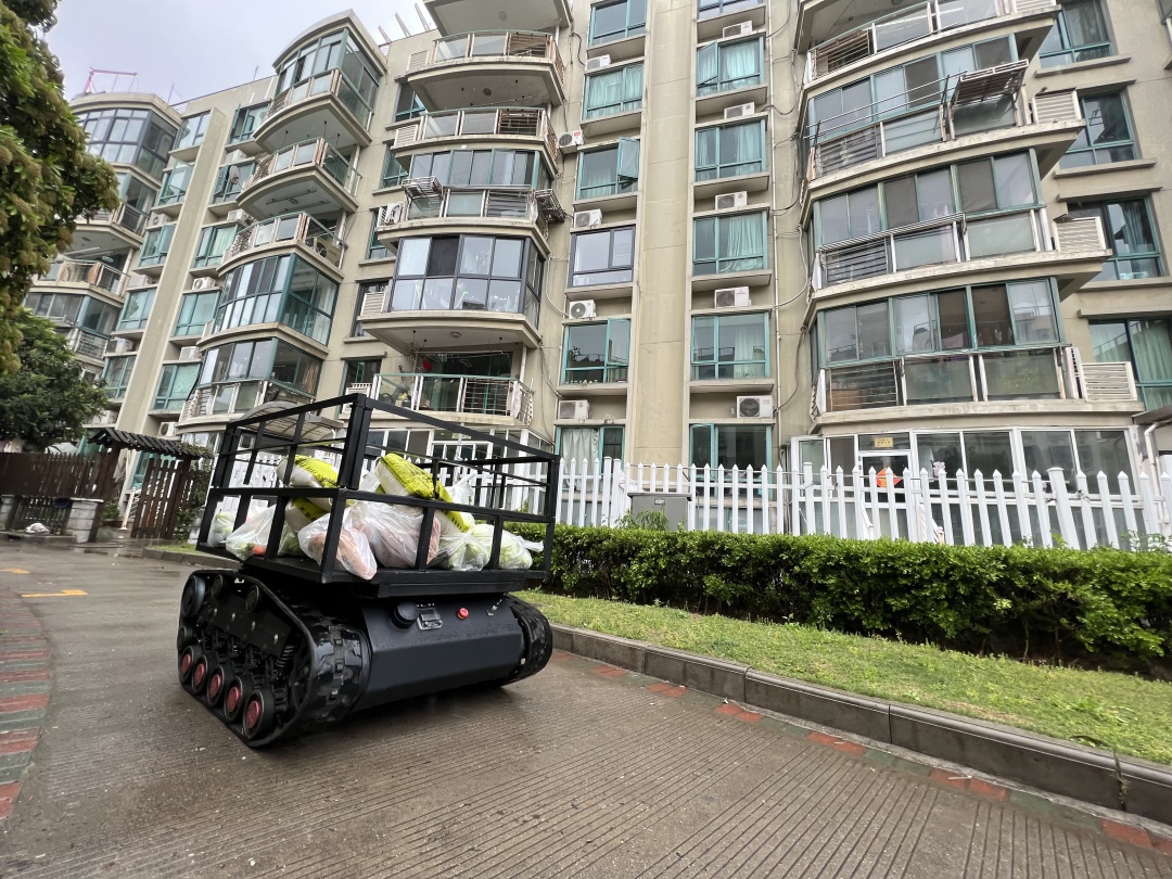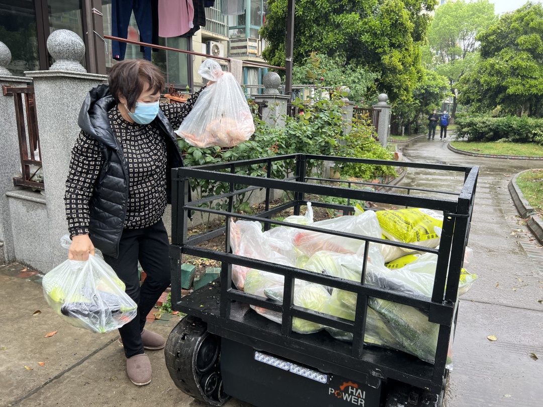 “我们小区里有一些赋黄码人员和管控人员,这款机器人可以距离60米左右通过遥控进行无接触配送,最大程度减小了风险,同时还有助我们第一时间将居民订的蔬菜物资送到他们家里,效率更高。” 周市镇康泾湾社区网格长吉丽说。