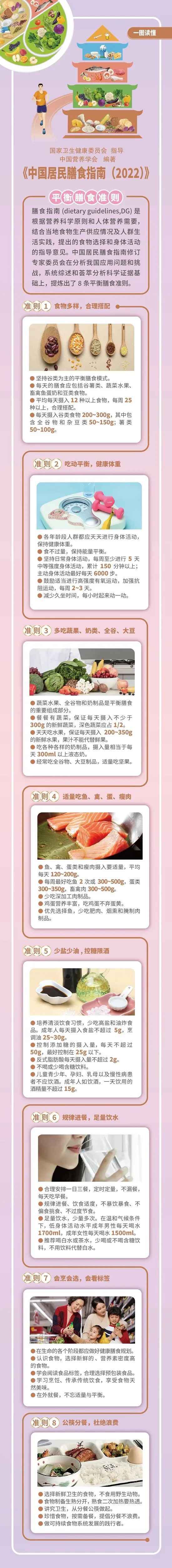 4月26日,《中国居民膳食指南(2022)》发布,提炼出了平衡膳食八准则:一、食物多样,合理搭配;二、吃动平衡,健康体重;三、多吃蔬果、奶类、全谷、大豆;四、适量吃鱼、禽、蛋、瘦肉;五、少盐少油,控糖限酒;六、规律进餐,足量饮水;七、会烹会选,会看标签;八、公筷分餐,杜绝浪费。