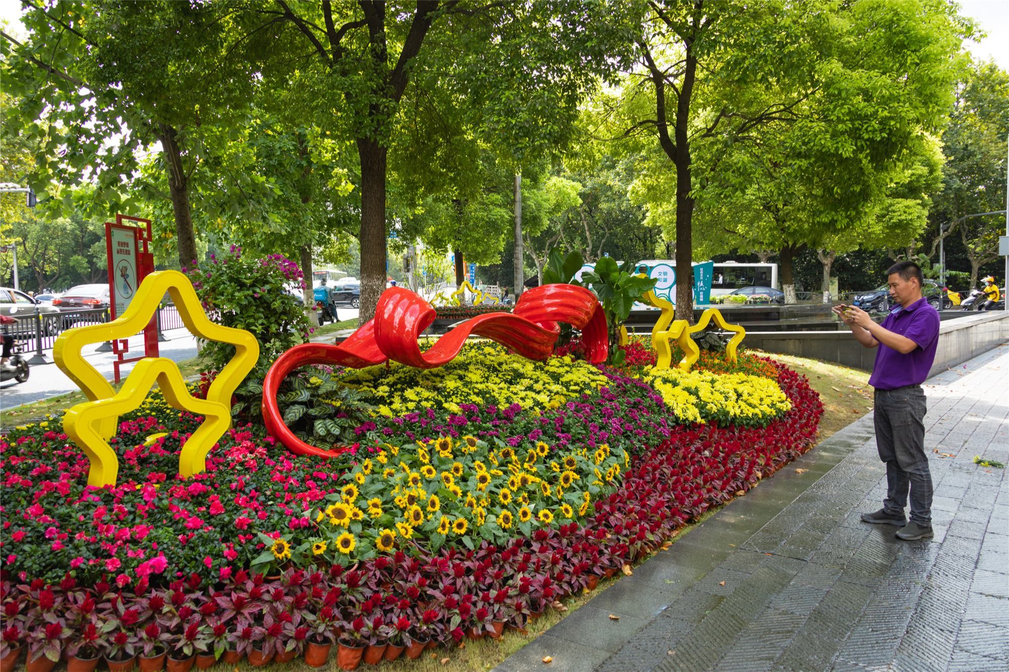 经过提升改造,震川路与柏庐路交界处的三角地面貌焕然一新,红色飘带与五角星的构筑物十分亮眼,菊花、向日葵、三角梅等植物错落有致,路过的市民纷纷驻足观赏拍照。