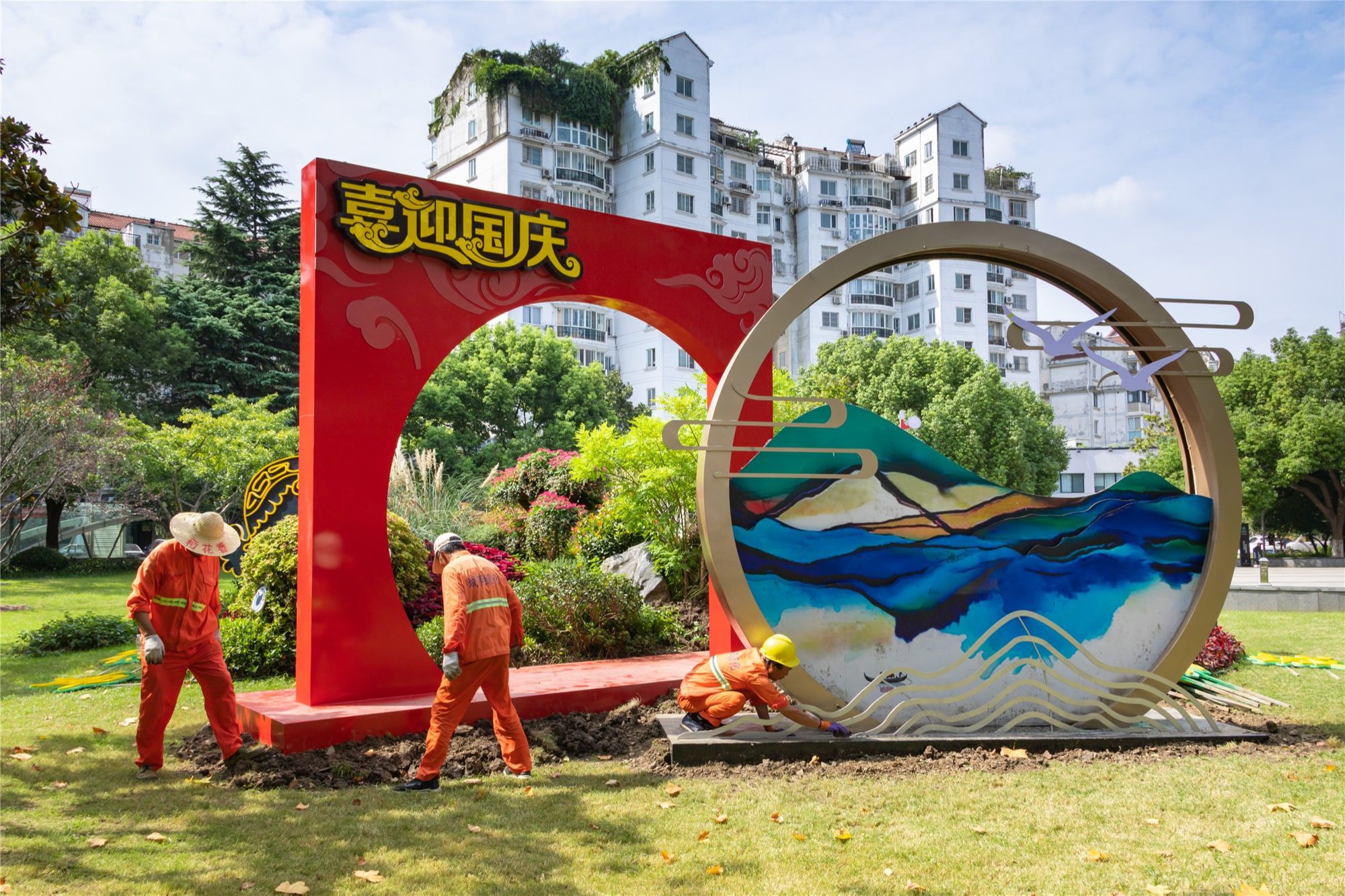 9月26日上午,记者在柏庐广场看到,园林工人正在对已经搭建成型的主题景观进行修整。整个造型采用苏式框景手法,在圆形画框中设计了水墨丹青的山水画景色,江南韵味十足。圆形画框与红色镜框相互映衬,渲染了喜庆的节日氛围。