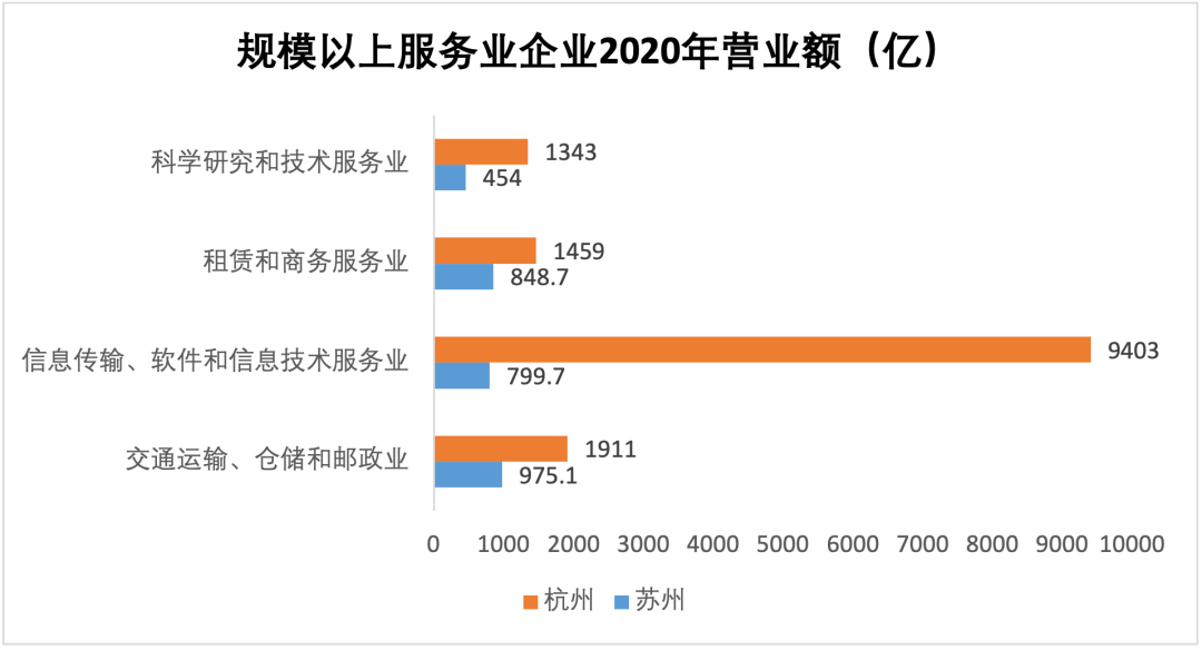 2020年,苏州规模以上交通运输、仓储和邮政业营业收入为975.1亿元,低于杭州的1911亿元;苏州规上信息传输、软件和信息技术服务业营业收入为799.7亿元,远低于杭州的9403亿元;苏州规上租赁和商务服务业营业收入为848.7亿元,低于杭州的1459亿元;苏州规上科学研究和技术服务业营业收入为454亿元,低于杭州的1343亿元。