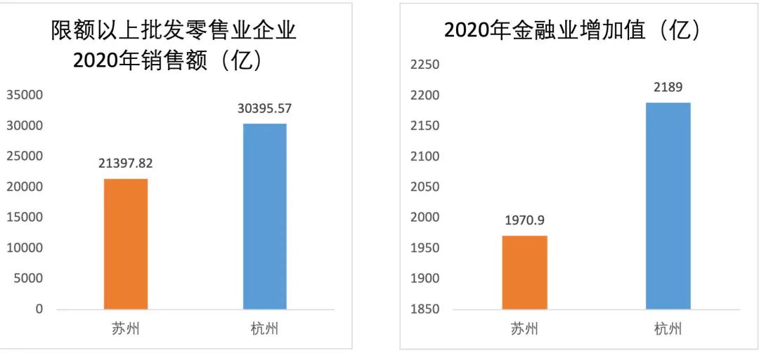 2020年,苏州限额以上批发零售业销售额为21397.82亿元,低于杭州的30395.57亿元;苏州金融业增加值1970.9亿元,低于杭州的2189亿元。